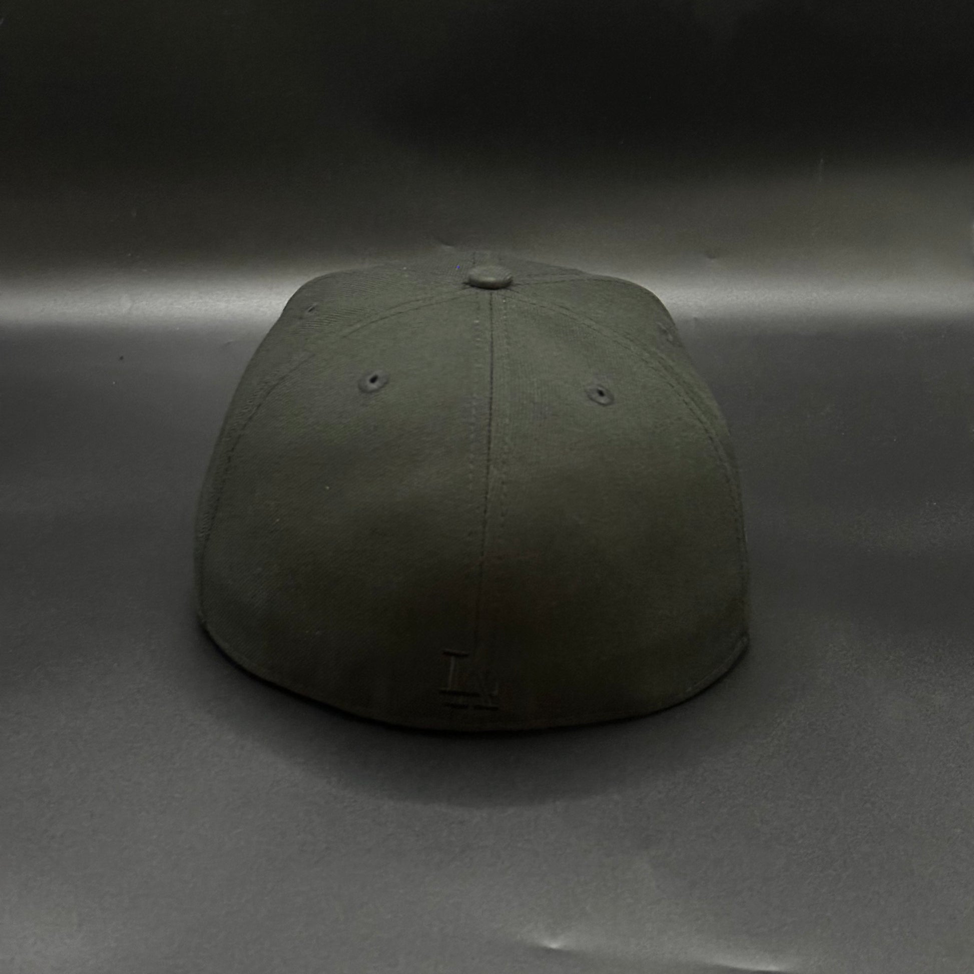 - All black crown with striking red flame accents and white Dodgers embroidery