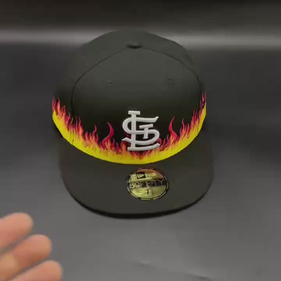 Light up your look with the Black Flames St. Louis Cardinals 59FIFTY by New Era. A sleek black crown with bold red flame embroidery, classic STL front logo, and premium fitted style — fiery energy for die-hard Cardinals fans.