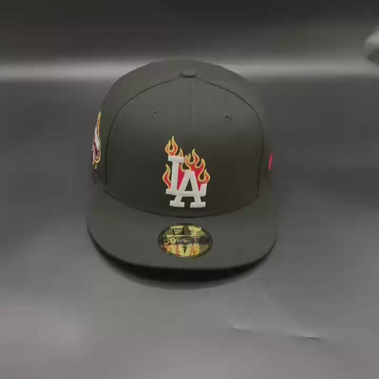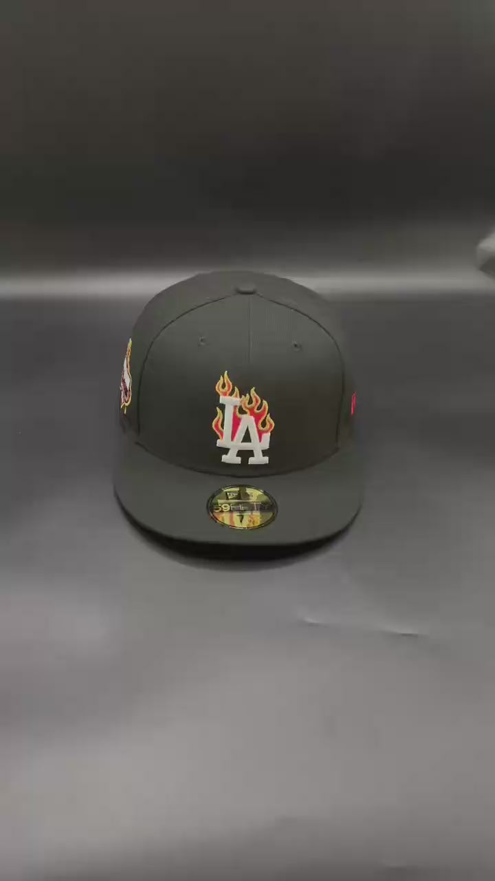 - Black crown with red visor, flame accents, and white Dodgers embroidery